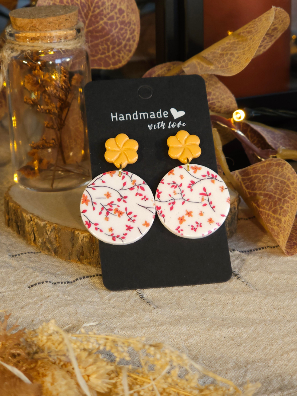 Boucles d'oreilles en argile polymère aux couleurs bleue, violette, orange, rouge et blanche au motifs floraux, faites main.