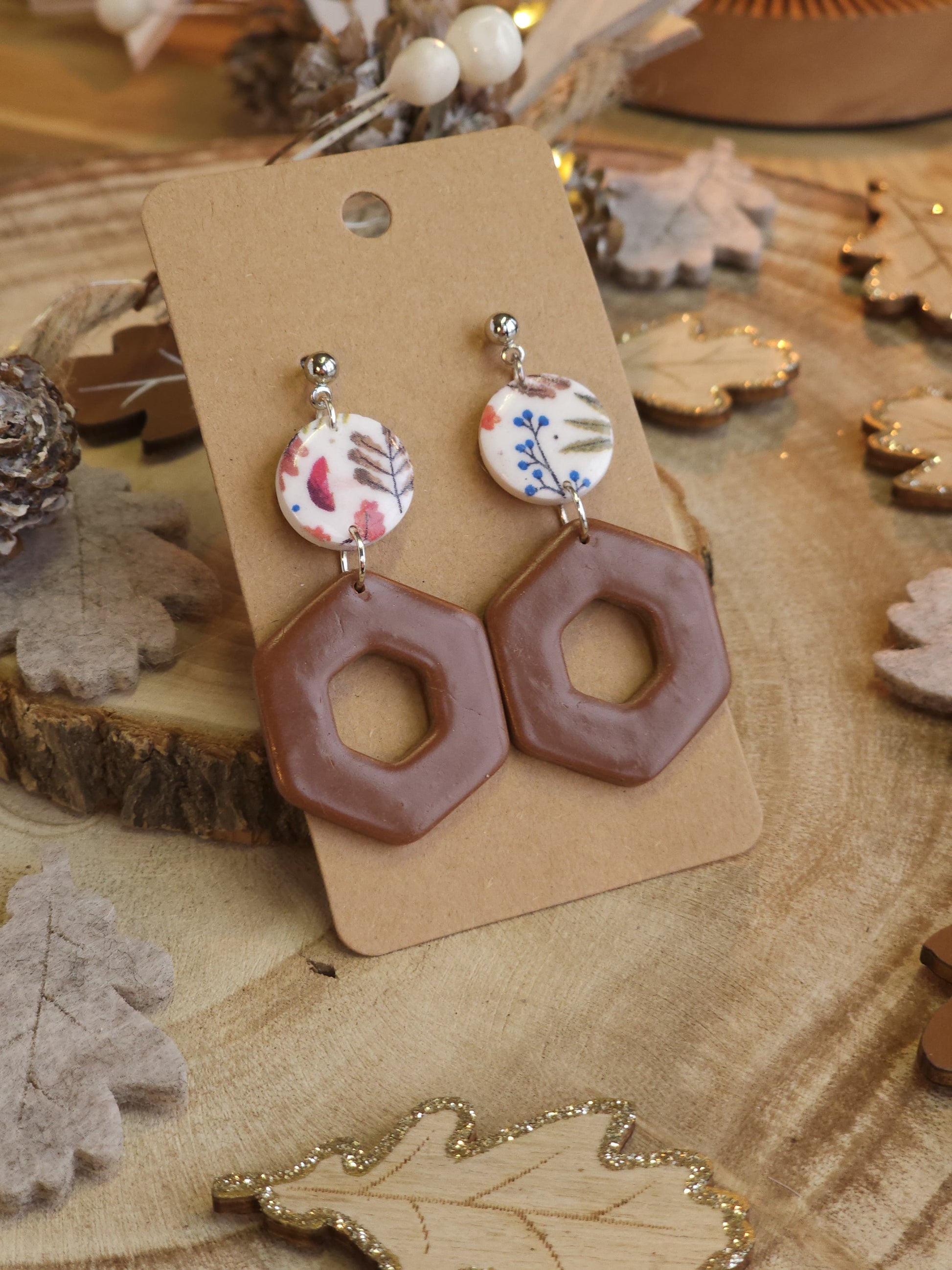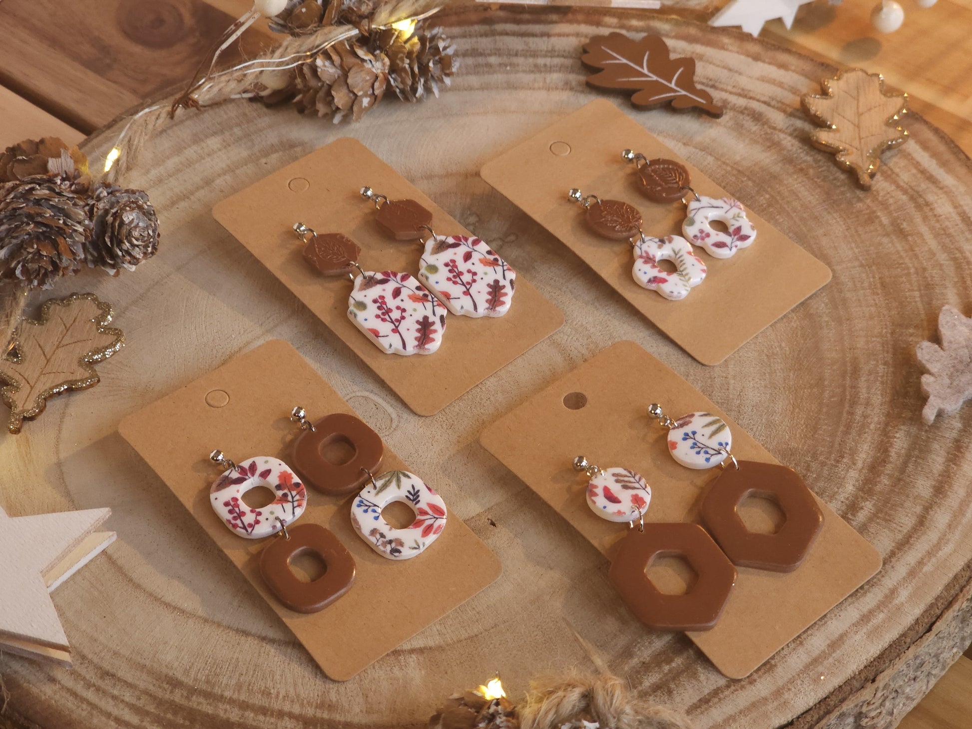 Boucles d'oreilles en argile polymère couleur caramel et blanche au motifs automnaux, faites main.