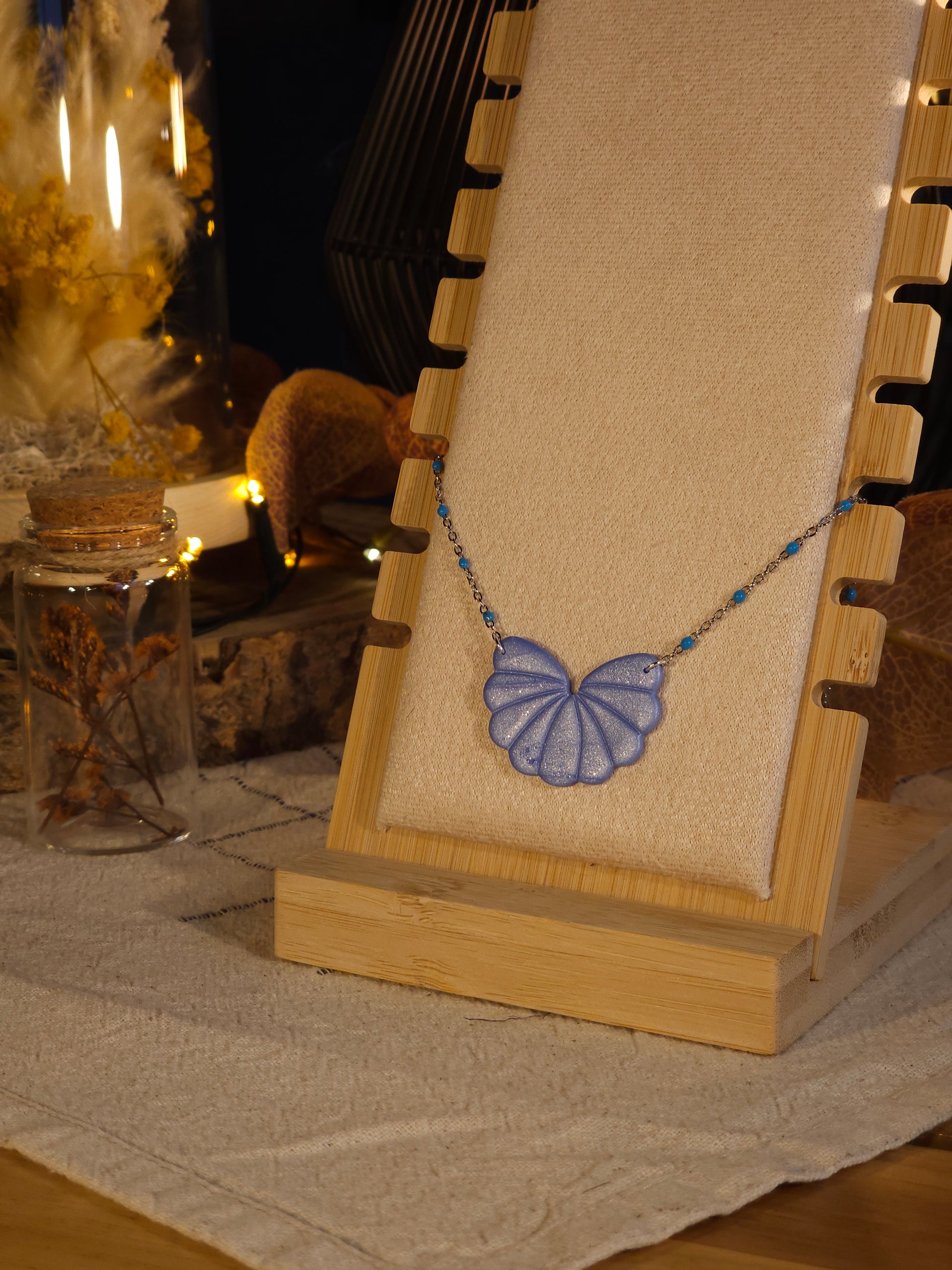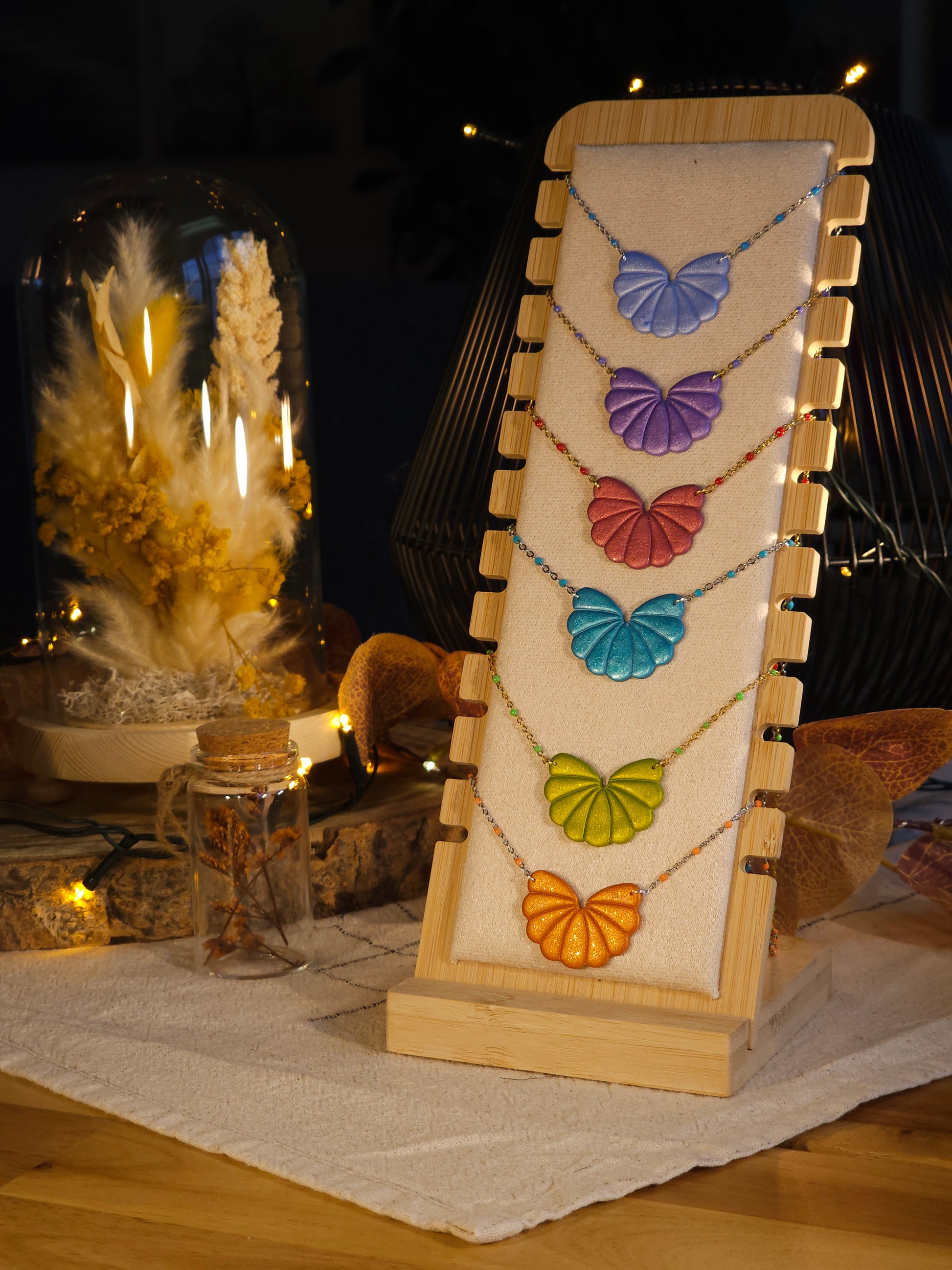 6 colliers au choix : bleu et argenté, lilas et doré, bordeaux et doré, turquoise et argenté, vert et doré ou orange et argenté.