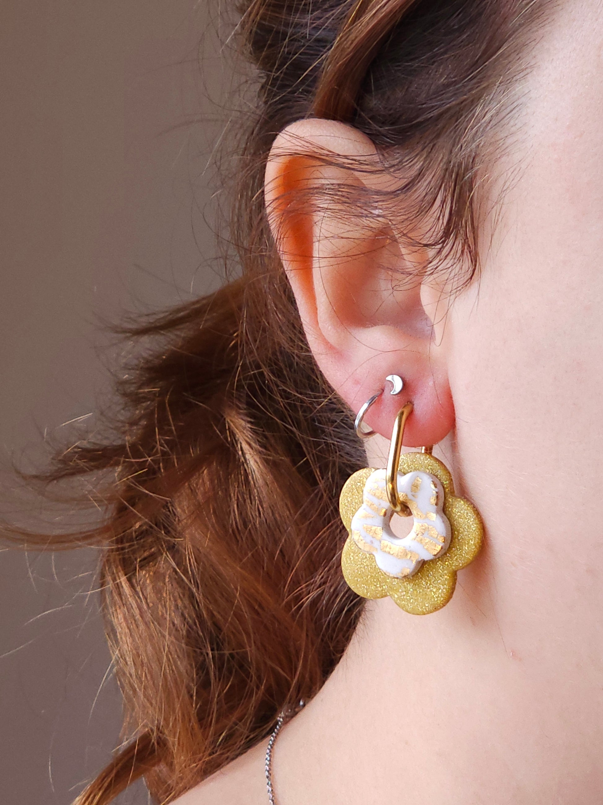Vous pouvez porter votre duo de 4 façons différentes : en grande fleur, en petite fleur, en combo empilé, et bien-sûr tu peux aussi juste porter les créoles !