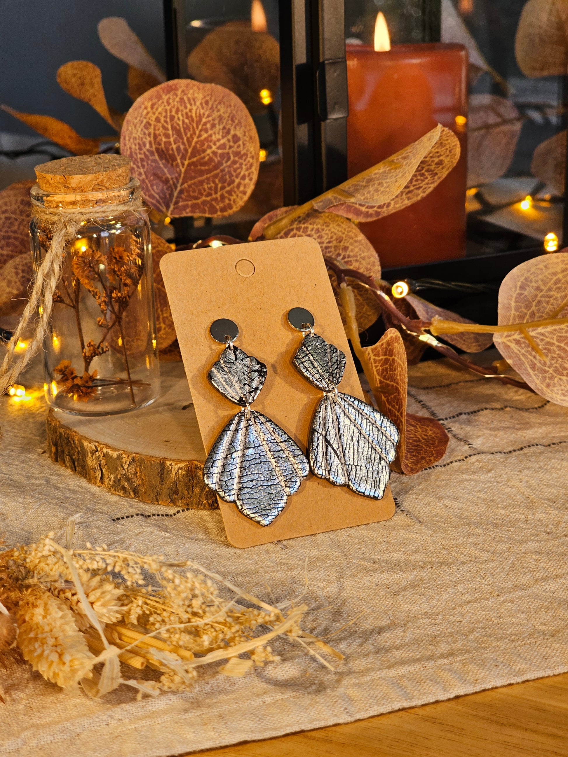 Boucles d'oreilles en argile polymère noire parsemée de feuilles d'argent et d'or.